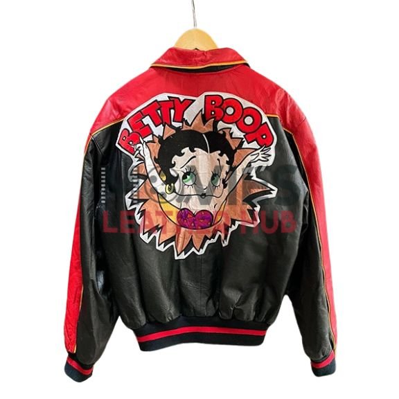 Step back into the bold vibe of the 90s with this Betty Boop leather bomber jacket – a real throwback for vintage lovers. Made from handmade premium leather, it mixes rich red and black tones that totally capture that classic street style. On the front, you’ve got the signature Betty Boop logo stitched on the chest, while the back steals the show with a big heart graphic that’s pure retro energy. With a comfy fit and shirt-style collar, it’s the kind of piece that turns heads without trying too hard.
