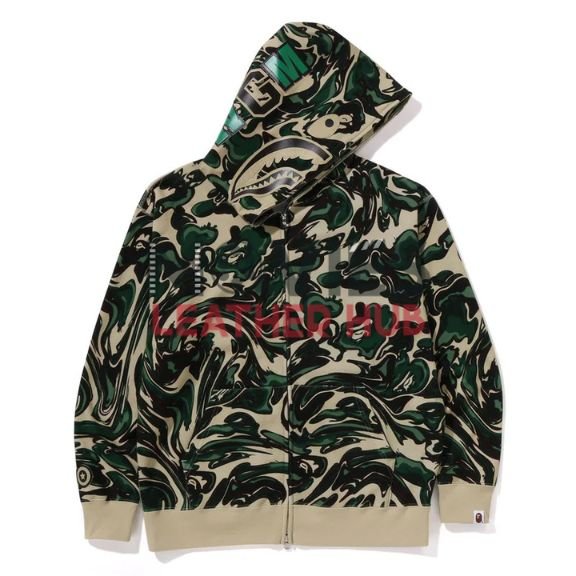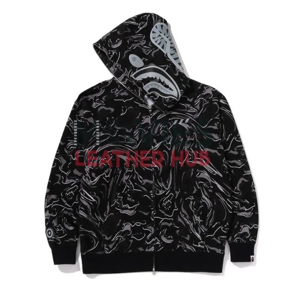 Turn heads with the Bape Marbling Camo Shark Relaxed Fit Full Zip Hoodie. The marbling camo design mixed with the bold shark face makes it super cool and different. It’s soft, comfy, and gives you extra room to move with its relaxed fit. Whether you’re out with friends or just relaxing at home, this hoodie keeps you warm and looking fresh. At Movies Leather Hub, we bring you stylish pieces that you’ll love to wear every day. Don’t wait too long or it’ll be gone!