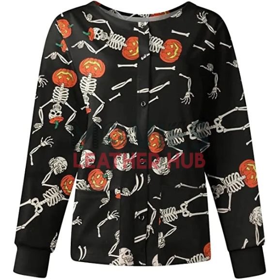 Bring fun and spooky vibes together with this Dancing Skeleton Pumpkins Halloween Scrub Jacket from Movies Leather Hub. The playful pumpkin and skeleton design makes it perfect for Halloween nights, parties, or even casual wear when you want to stand out. It feels soft, fits easy, and keeps you comfy while giving you that cool festive look. If you want a jacket that shows both fun and style, this one is a perfect pick.