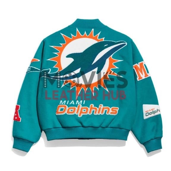 Cheer for the Dolphins in style with this bold teal varsity jacket! It’s made from warm wool and has that classic sporty look everyone loves. The bright teal color stands out, and the team logos make it a must-have for real fans. Whether you’re at the stadium or just hanging out, this jacket from Movies Leather Hub keeps you cozy and game-day ready.