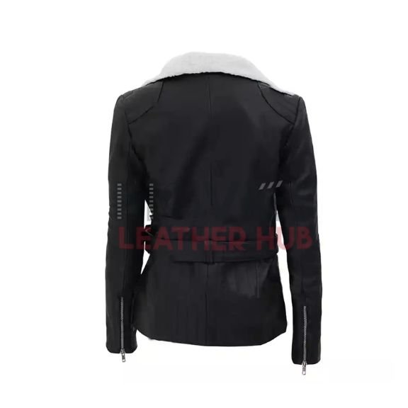 Stay cozy and stylish this winter with the Women’s Fur Black Leather Jacket. Made from high-quality genuine leather, this jacket is soft, durable, and perfect for cold weather. The plush fur collar adds warmth and a luxurious look, making it ideal for winter outings, holiday parties, and Christmas celebrations. With its sleek design and tailored fit, this jacket is perfect for pairing with any outfit. Inspired by the Women’s Shearling Black Belted Asymmetrical Biker Leather Jacket, it features a modern twist with a front zipper closure, full-length sleeves, and handy side pockets. This handmade, customizable jacket is a unique piece that reflects your personal style. Don’t wait—grab yours now during our Winter Sale at Movies Leather Hub!